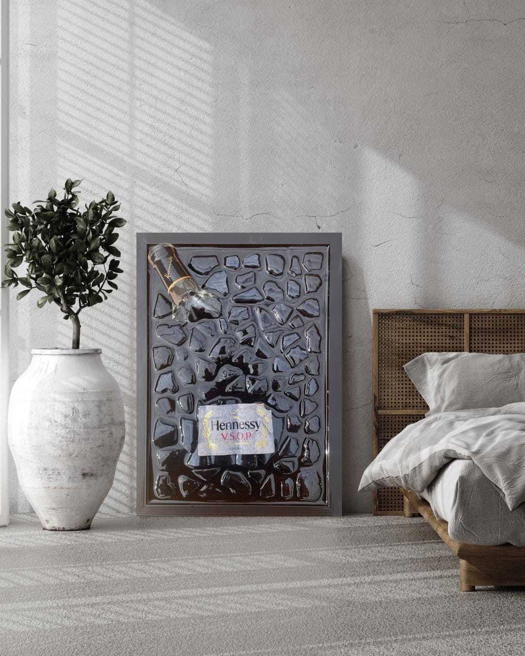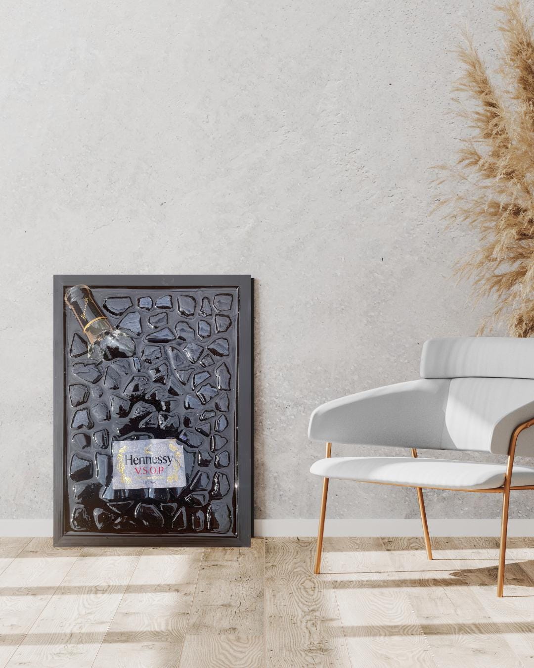 Discover the artistry and innovation of "Hennything V.S.O.P.," an exquisite piece of broken bottle art that transforms shards of glass into a captivating masterpiece. This epoxy art creation uses resilient resin to encapsulate each fragment, capturing both movement and texture in a unique display. Measuring 32 cm high by 23 cm wide. The vibrant colors and glossy finish evoke the essence of luxury in every detail, offering an artistic nod to modern sophistication. Perfect as a gift for him, this piece not only adds a touch of elegance to any setting but also speaks to the refined taste of its owner. Whether displayed in an office or living space, "Hennything V.S.O.P." invites conversation and admiration with its blend of creativity and craftsmanship. Its distinctive style is sure to leave a lasting impression, making it a standout artwork in any collection.