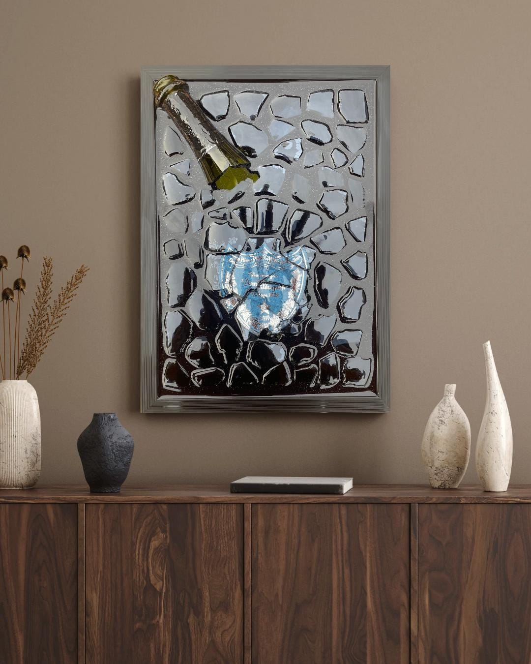 Discover a masterpiece of modern creativity with our Broken Bottle Artwork, where the vibrant allure of Pérignon Blue 2002 meets the iconic style of Andy Warhol. This limited edition piece is not just art; it‘s a captivating expression in epoxy and resin, capturing the essence of shattered beauty and transformation. Like a mesmerizing symphony, this artwork harmoniously blends the rich purple hues with the glossy sheen of resin, creating an eye-catching centerpiece for any sophisticated space.