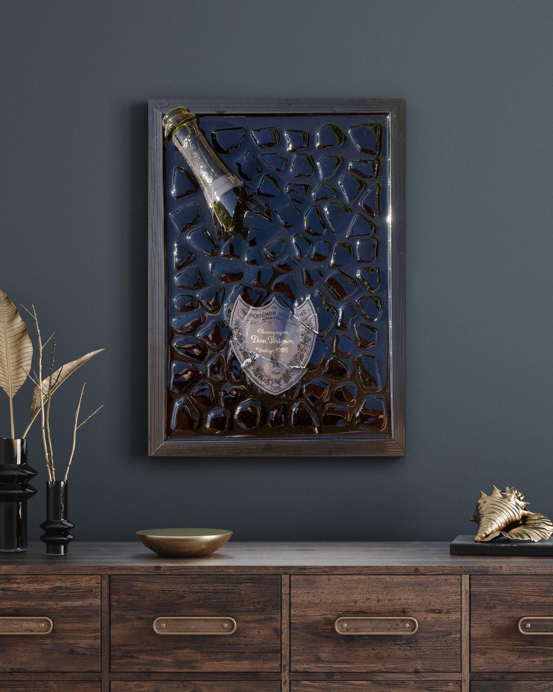 Elevate your home decor with this luxurious epoxy champagne Broken Bottle art, inspired by the iconic P2 1998 Pérignon. Measuring 23 cm wide by 32 cm high, this handcrafted piece captures the essence of celebration and sophistication. The glossy epoxy finish enhances the rich tones and intricate details, making it a stunning statement piece for modern interiors or a perfect gift for champagne connoisseurs and art lovers alike.